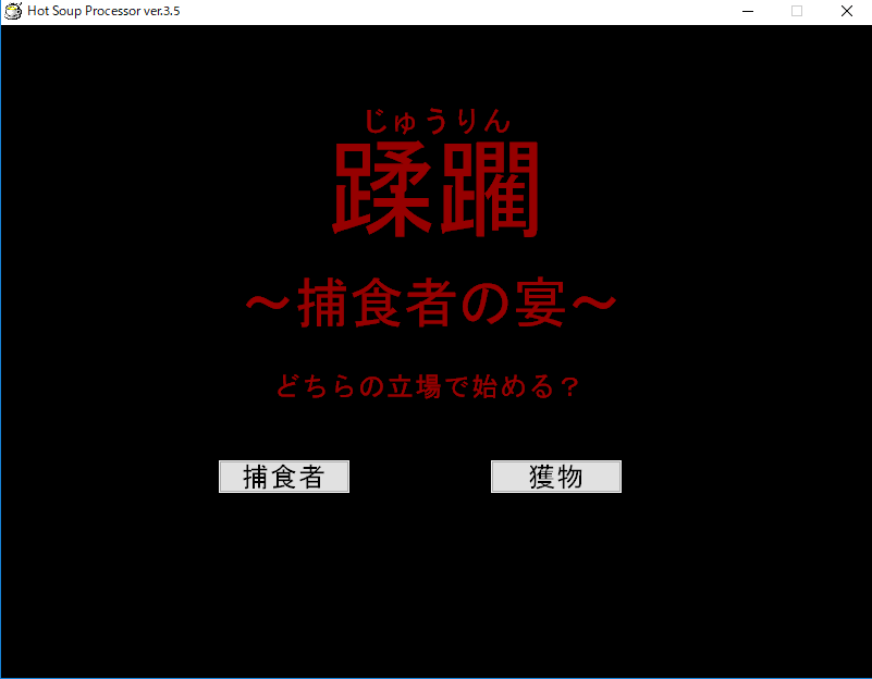 蹂躙~捕食者の宴~制作1 Blog 2018.02.072018.02.12 今日はプログラミング言語のHSPでゲームを作っています。 どんなゲームを作っているのかというと↓ 「蹂躙 捕食者の宴」というタイトルで、竜など捕食者の立場になって獲物を嬲ったり、逆に人などの獲物の立場になって嬲られたりするゲームです。 まだ捕食者と獲物はそれぞれ1体ずつしか設定してませんが、完成後に随時増やしていく予定です。 現在完成を目指し作業を進めているので気長に待っていただけると幸いです。